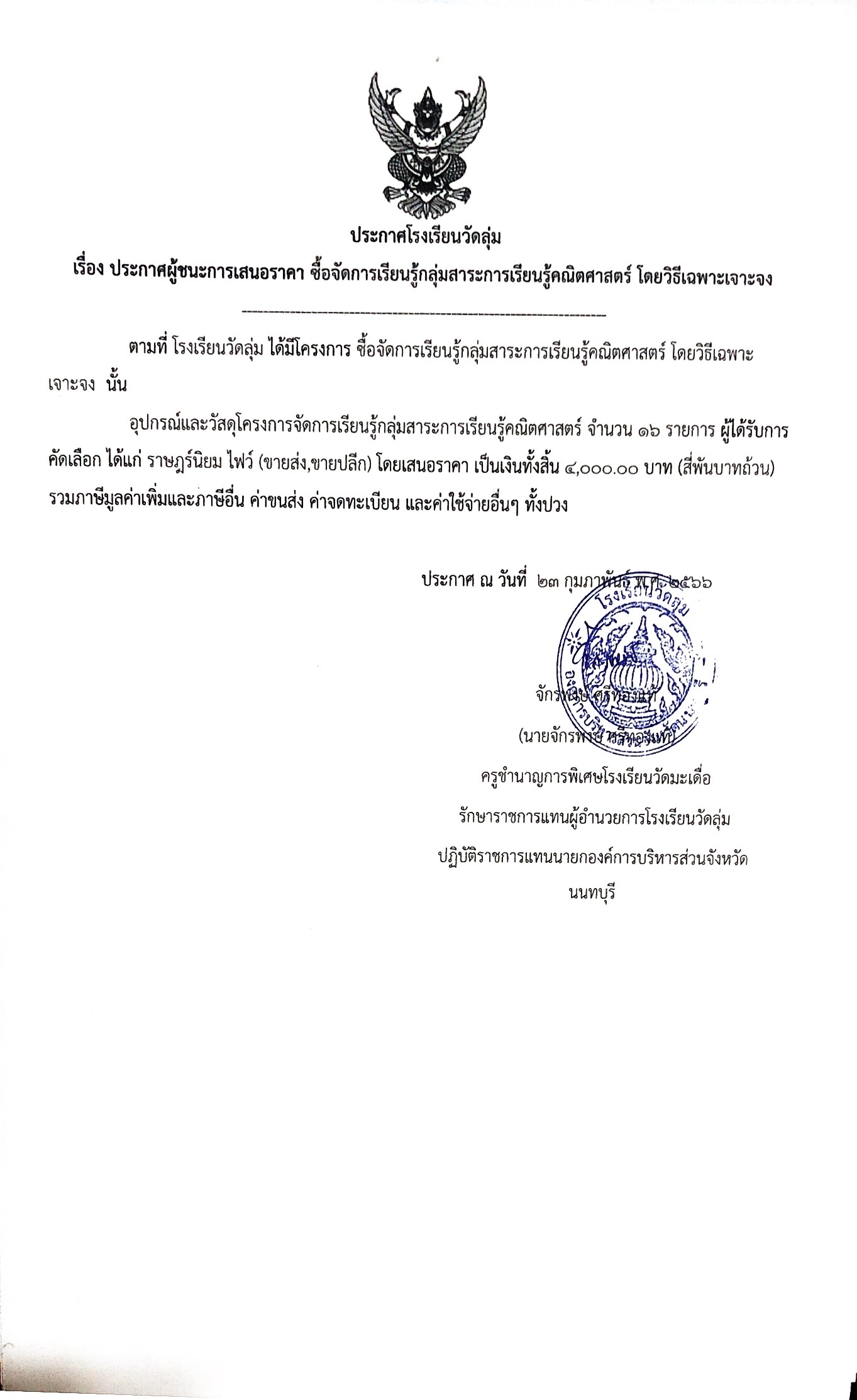 ประกาศโครงการจัดการเรียนรู้กลุ่มสาระการเรียนรู้คณิตสาสตร์