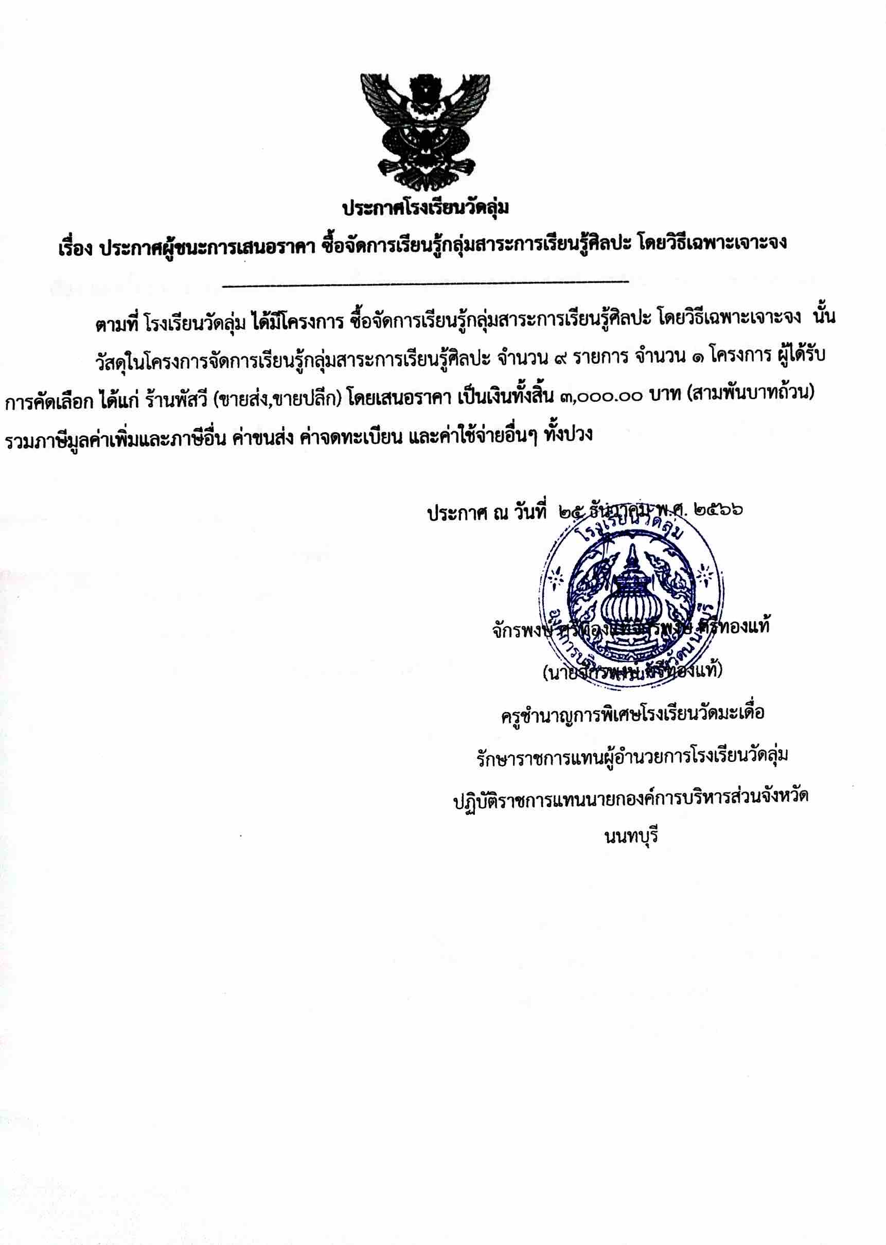 ประกาศโครงการจัดการเรียนรู้กลุ่มสาระการเรียนรู้ศิลปะ
