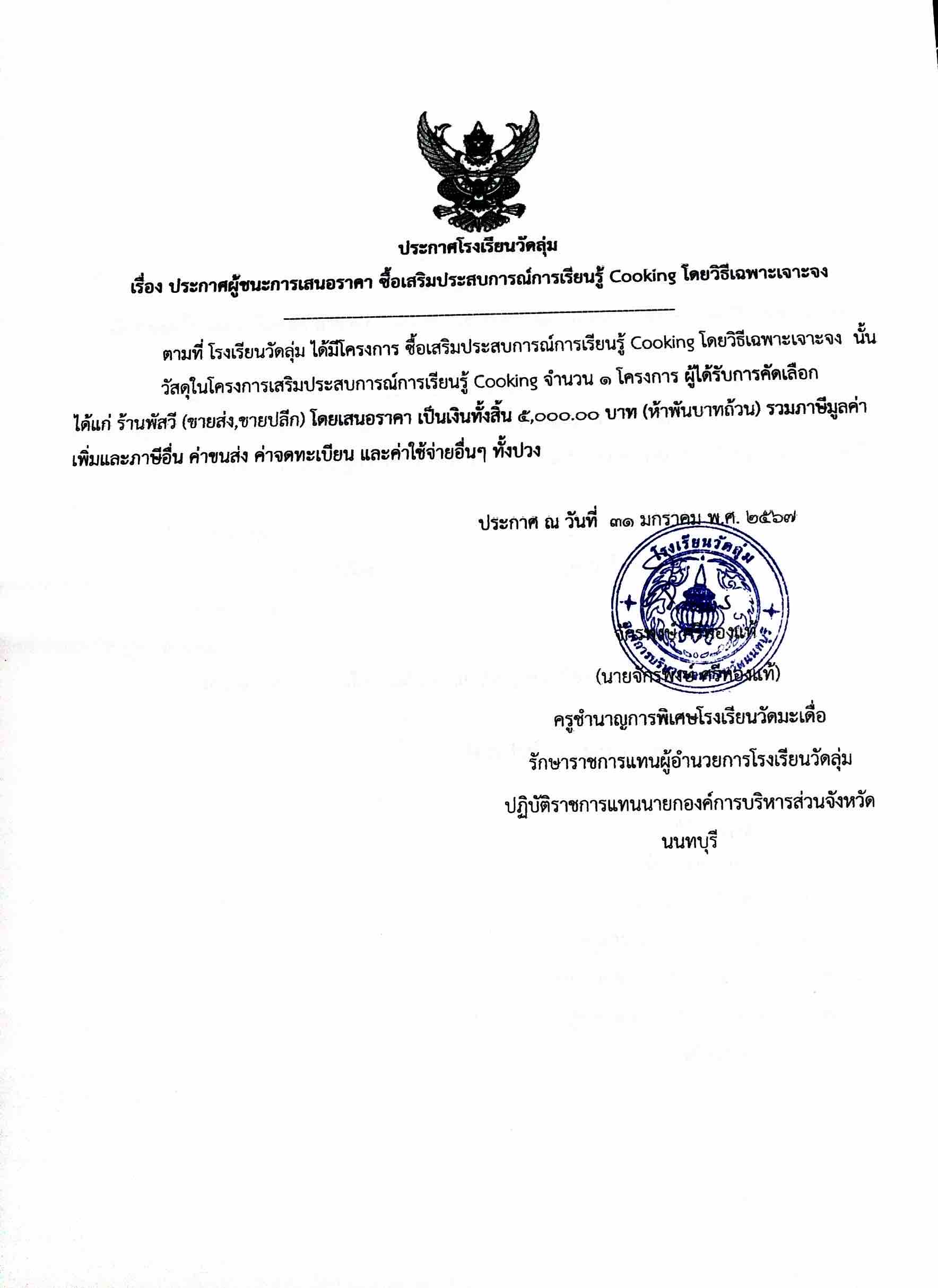 ประกาศโครงการเสริมประสบการณ์การเรียนรู้ Cooking