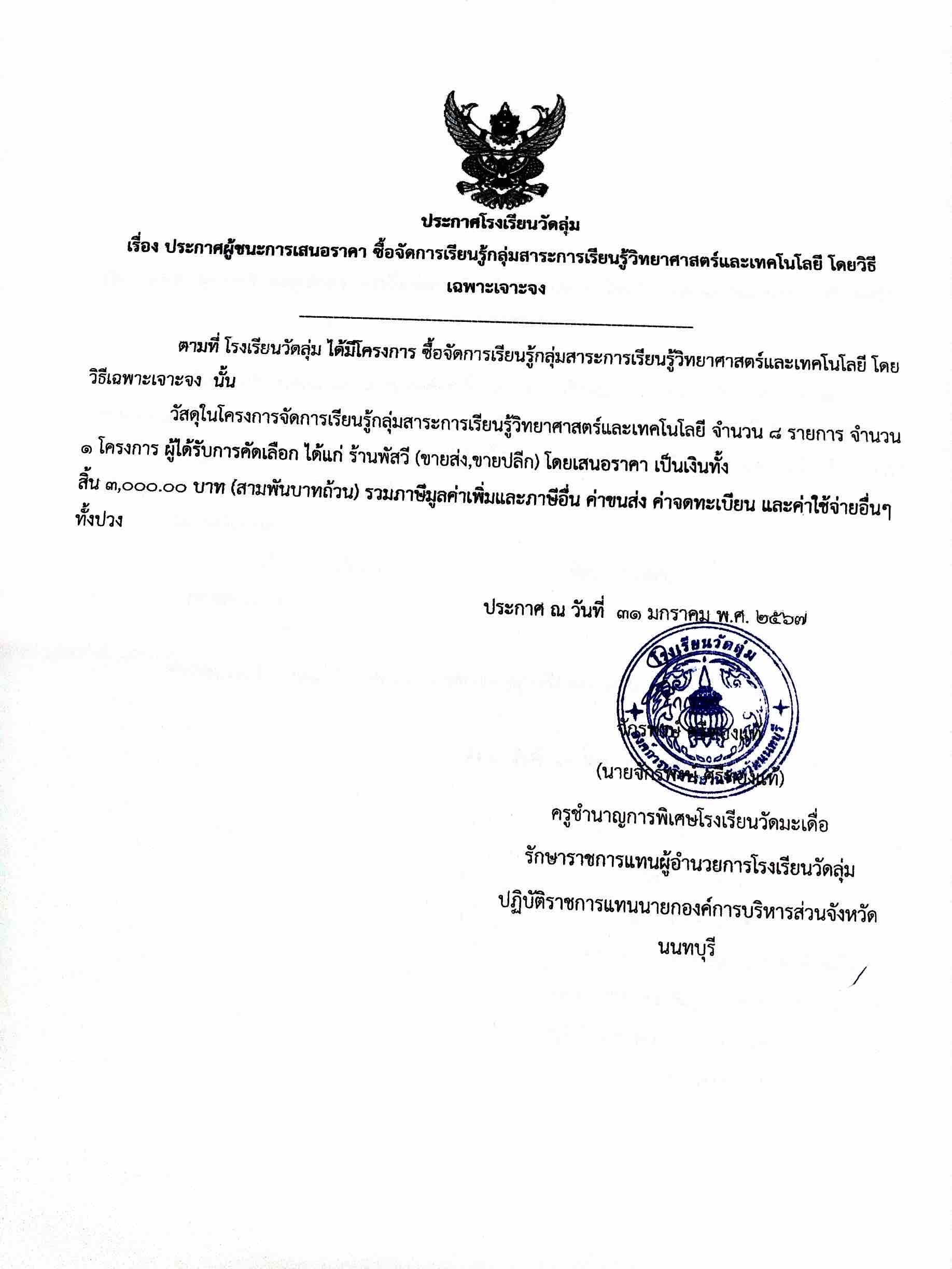 ประกาศโครงการจัดการเรียนรู้กลุ่มสาระการเรียนรู้วิทยาศาสตร์และเทคโนโลยี