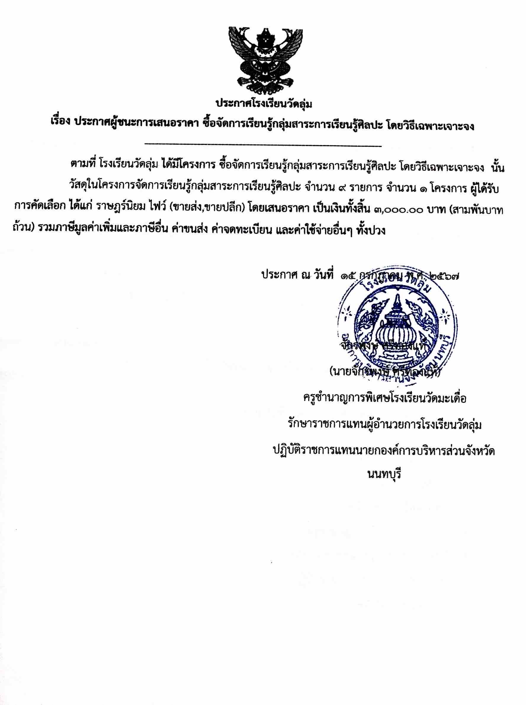 ประกาศโครงการจัดการเรียนรู้กลุ่มสาระการเรียนรู้ศิลปะ