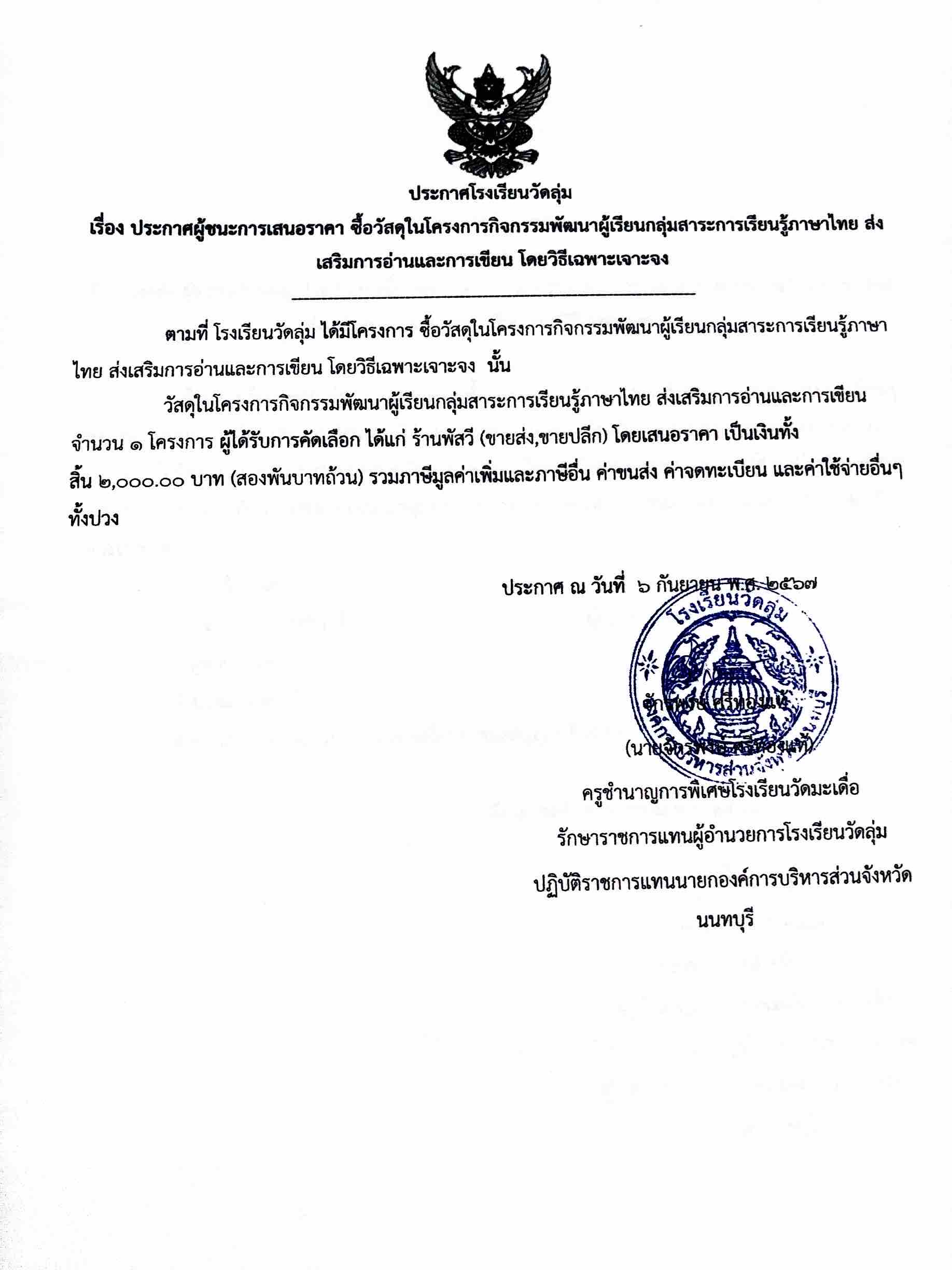 ประกาศโครงการกิจกรรมพัฒนาผู้เรียนกลุ่มสาระการเรียนรู้ภาษาไทย ส่งเสริมการอ่านและการเขียน