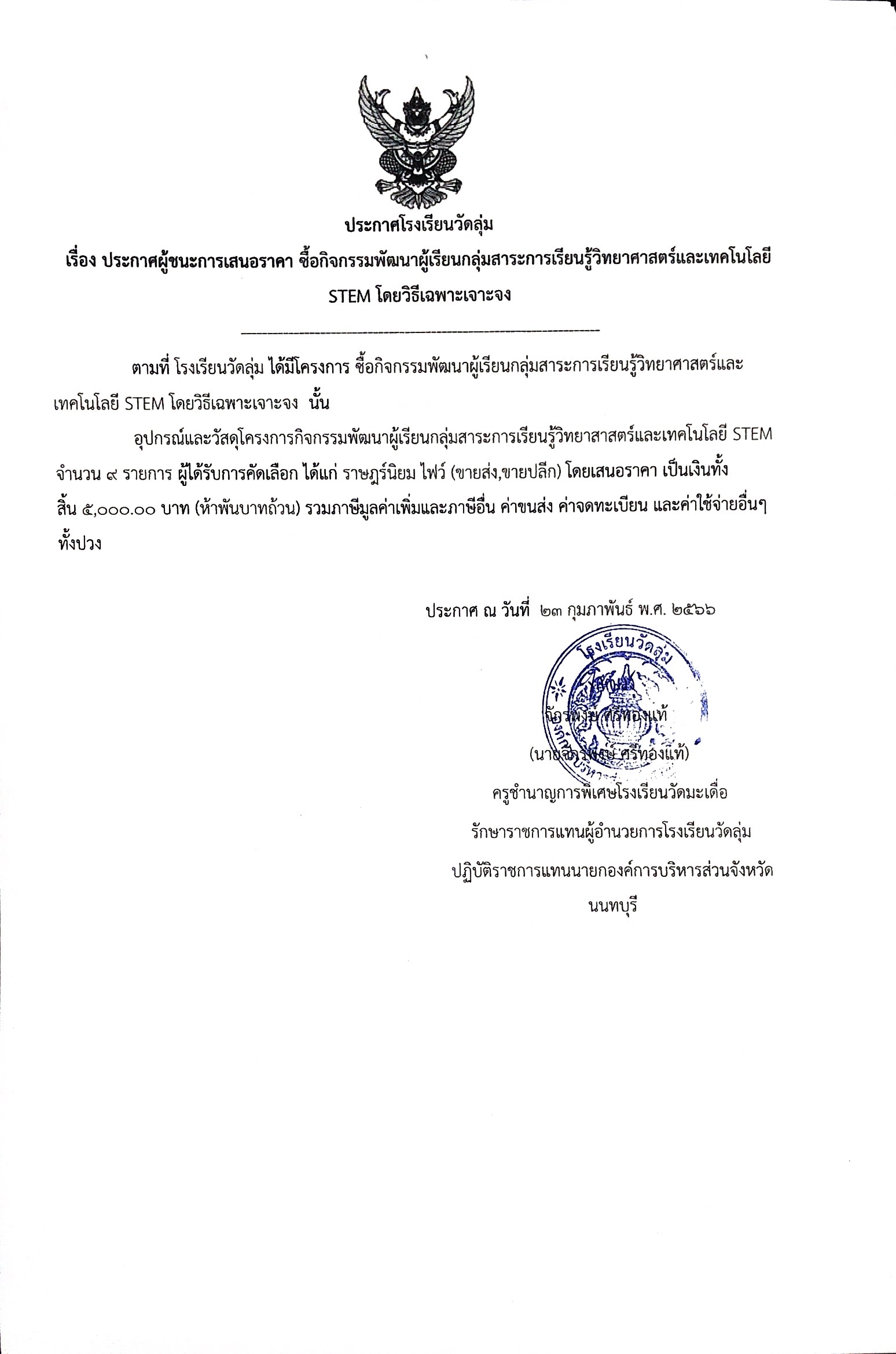 ประกาศโครงการกิจกรรมพัฒนาผู้เรียนกลุ่มสาระการเรียนรู้วิทยาศาสตร์และเทคโนโลยี STEM