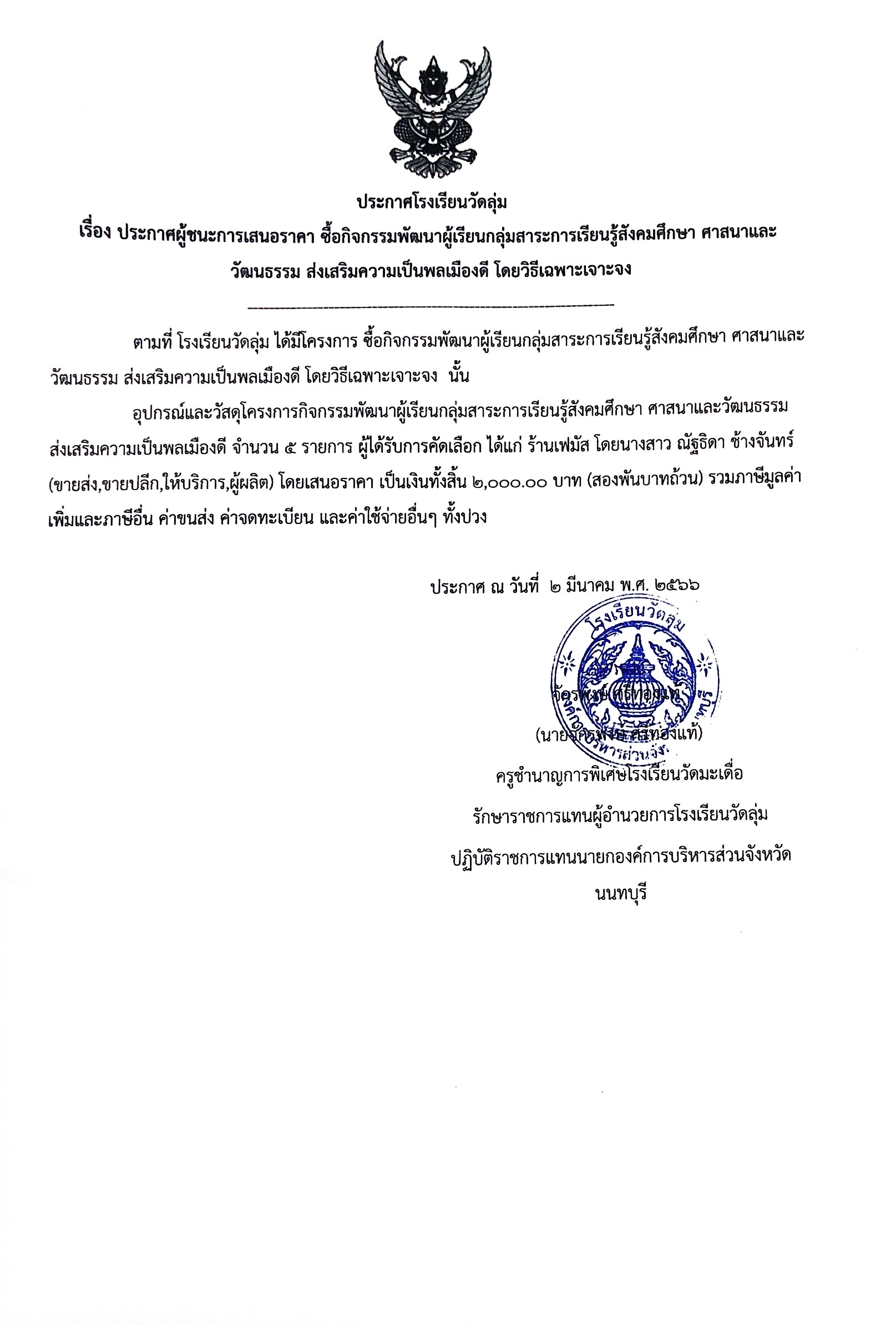 ประกาศโครงการกิจกรรมพัฒนาผู้เรียนกลุ่มสาระการเรียนรู้สังคม ส่งเสริมการเป็นพลเมืองที่ดี