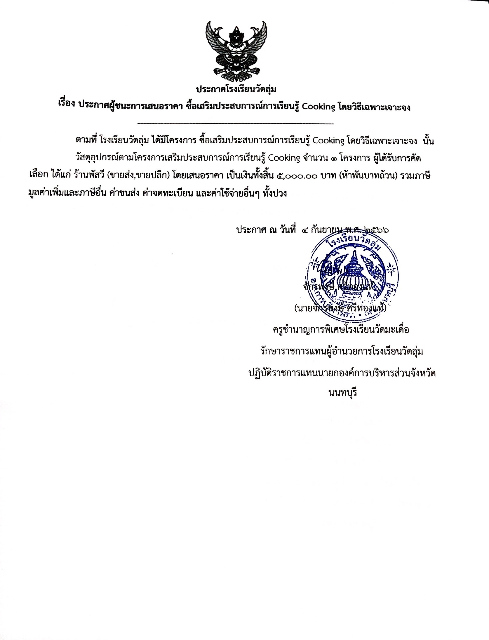 ประกาศโครงการเสริมประสบการณ์การเรียนรู้ Cooking