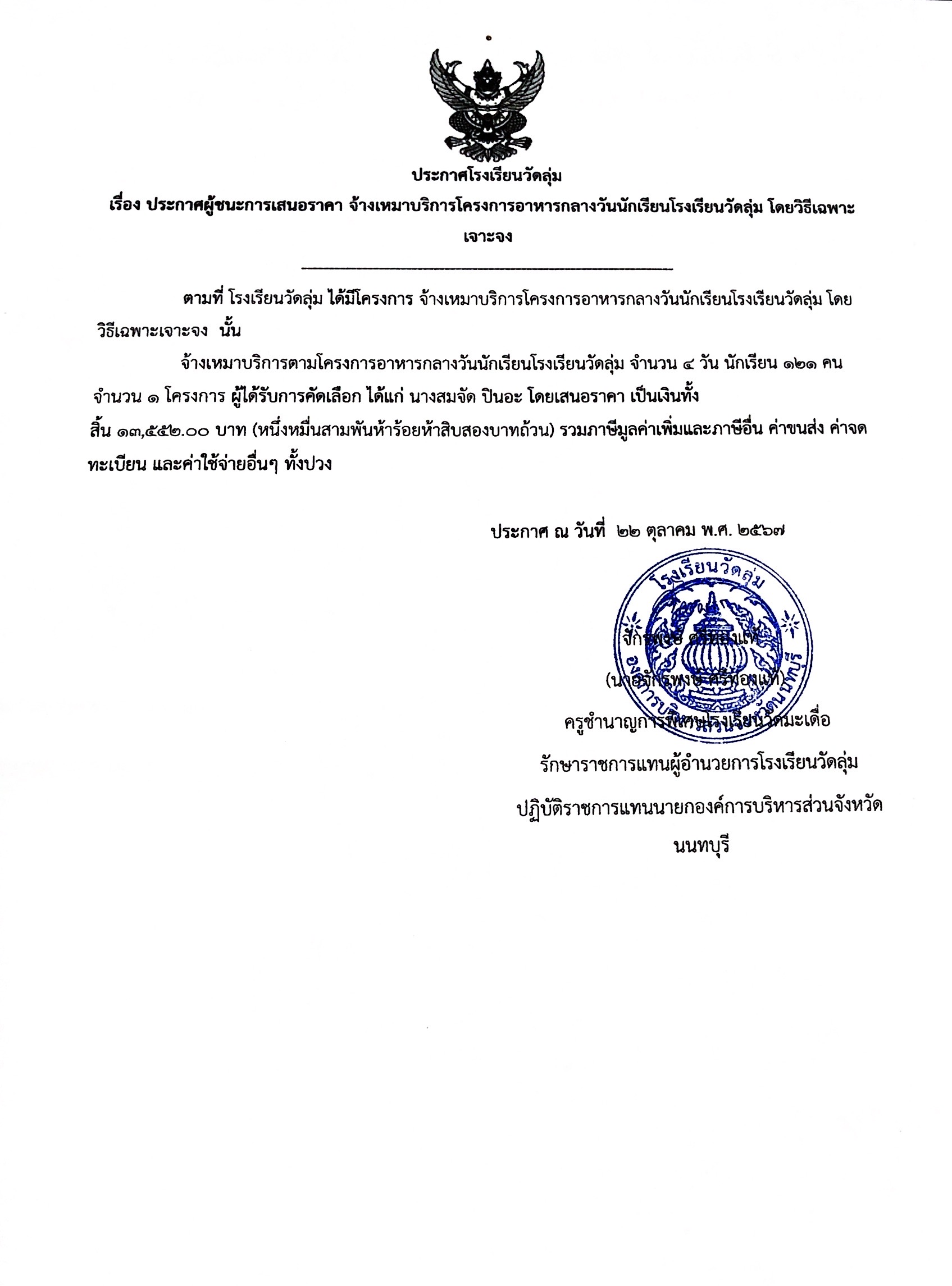 ประกาศโครงการอาหารกลางวันนักเรียนโรงเรียนวัดลุ่ม