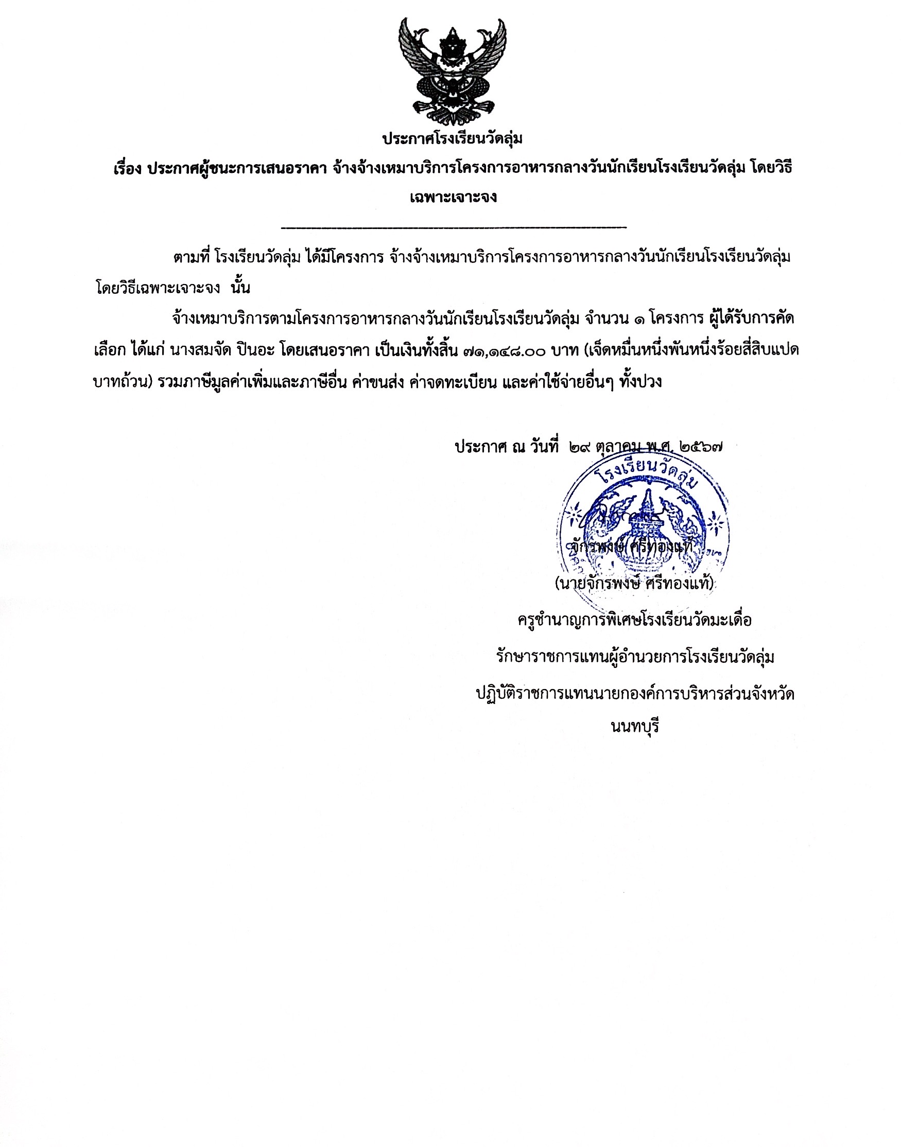 ประกาศโครงการอาหารกลางวันนักเรียนโรงเรียนวัดลุ่ม