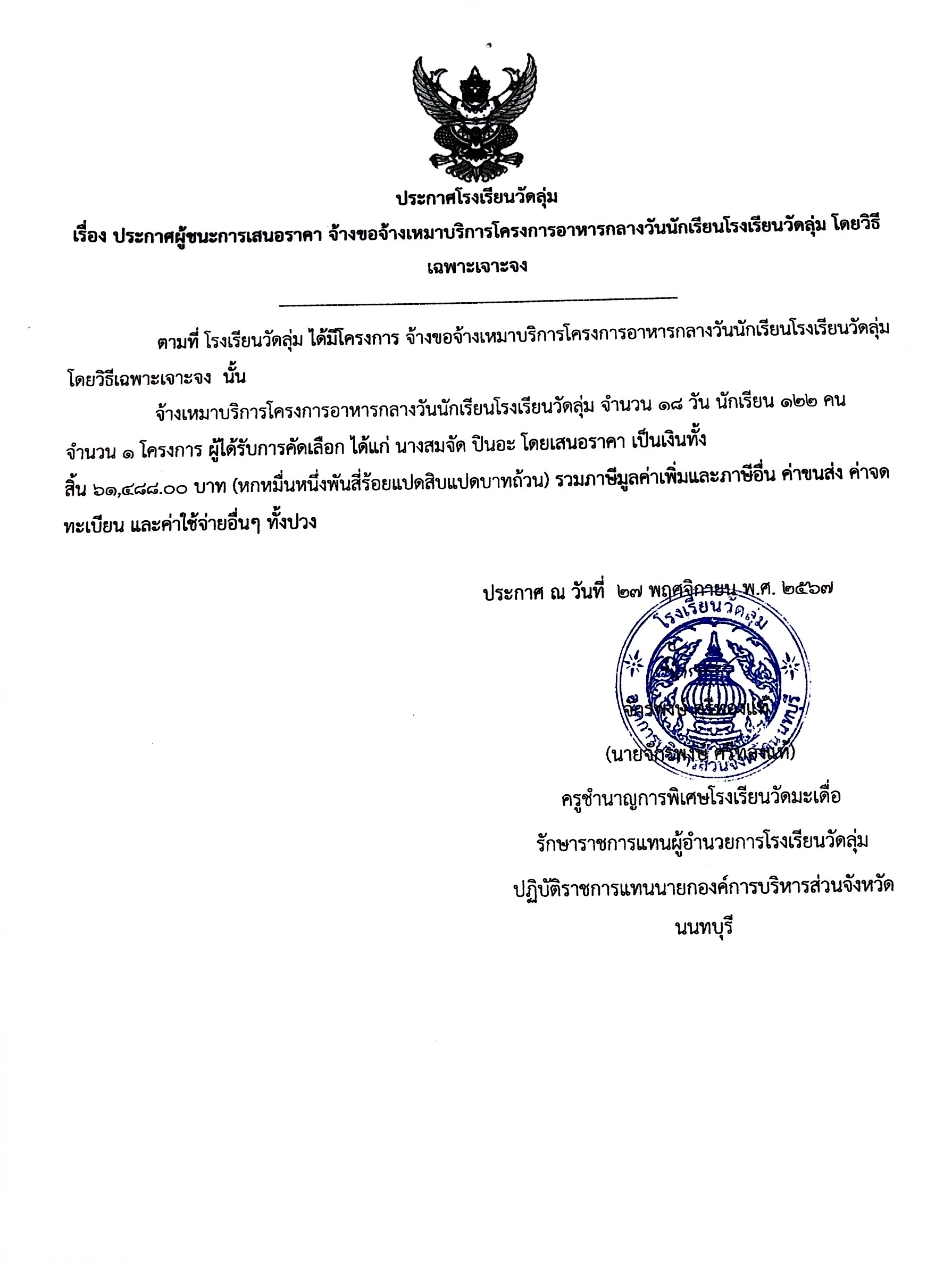 ประกาศโครงการอาหารกลางวันนักเรียนโรงเรียนวัดลุ่ม