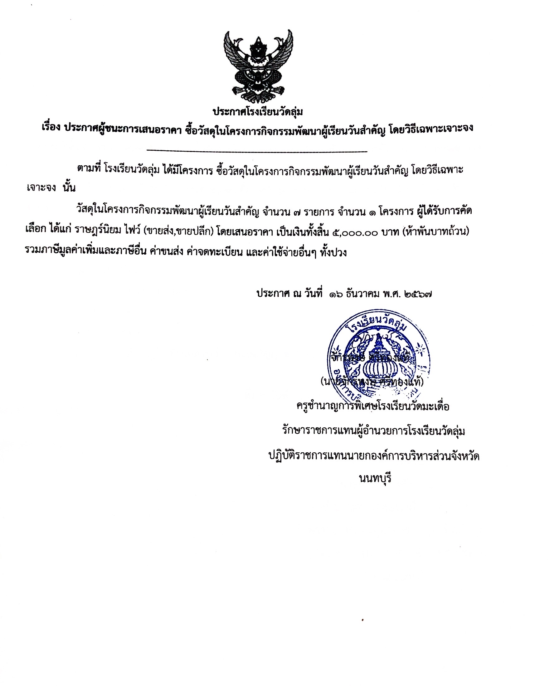 ประกาศโครงการกิจกรรมพัฒนาผู้เรียนวันสำคัญ
