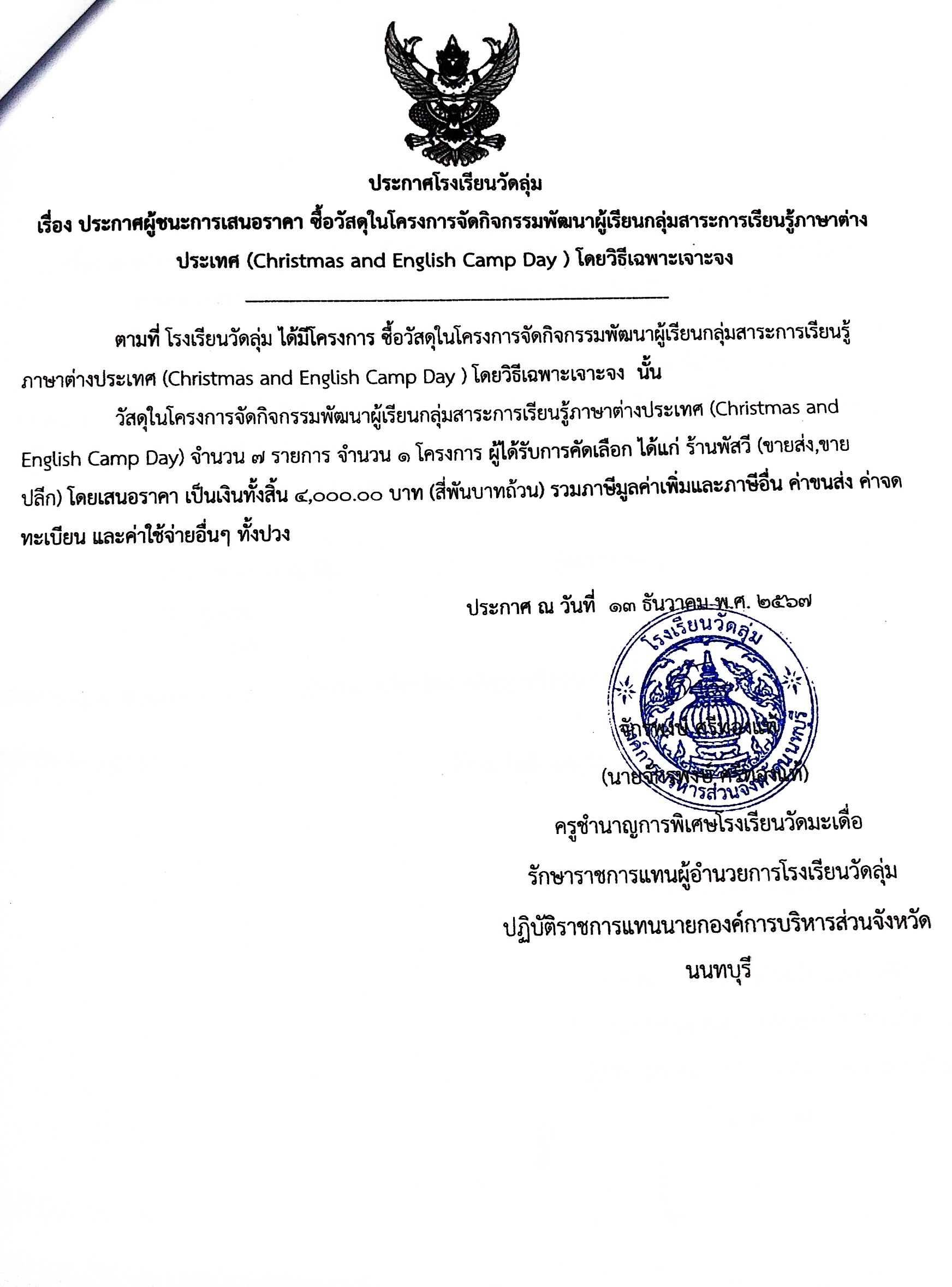 ประกาศโครงการจัดกิจกรรมพัฒนาผู้เรียนกลุ่มสาระการเรียนรู้ภาษาต่างประเทศ (Christmas and English Camp Day)