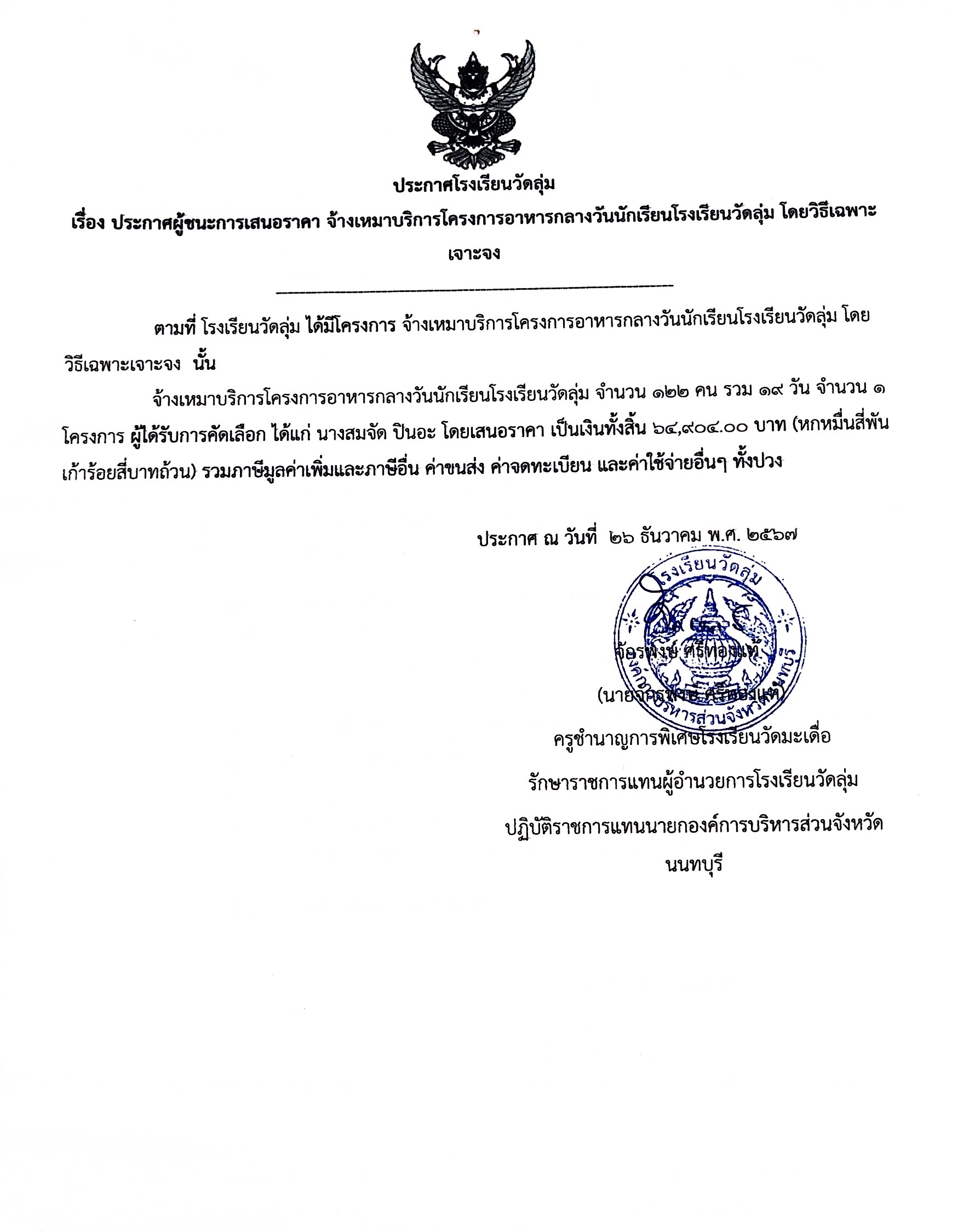 ประกาศโครงการอาหารกลางวันนักเรียนโรงเรียนวัดลุ่ม