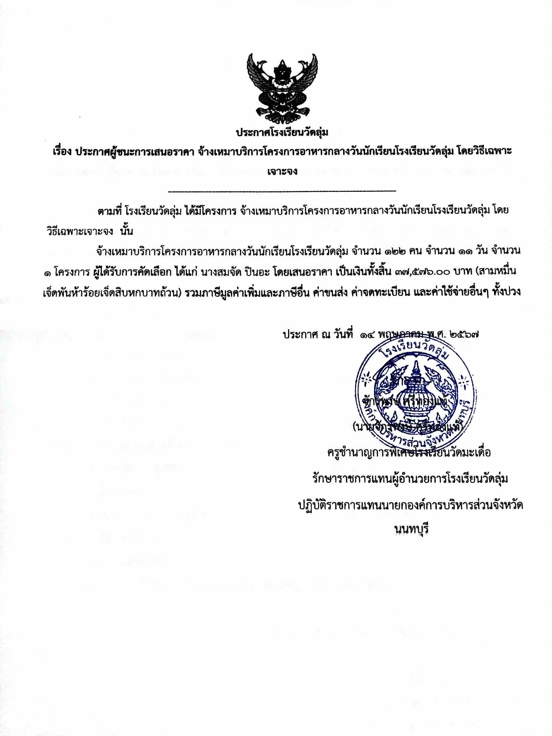 ประกาศโครงการอาหารกลางวันนักเรียนโรงเรียนวัดลุ่ม