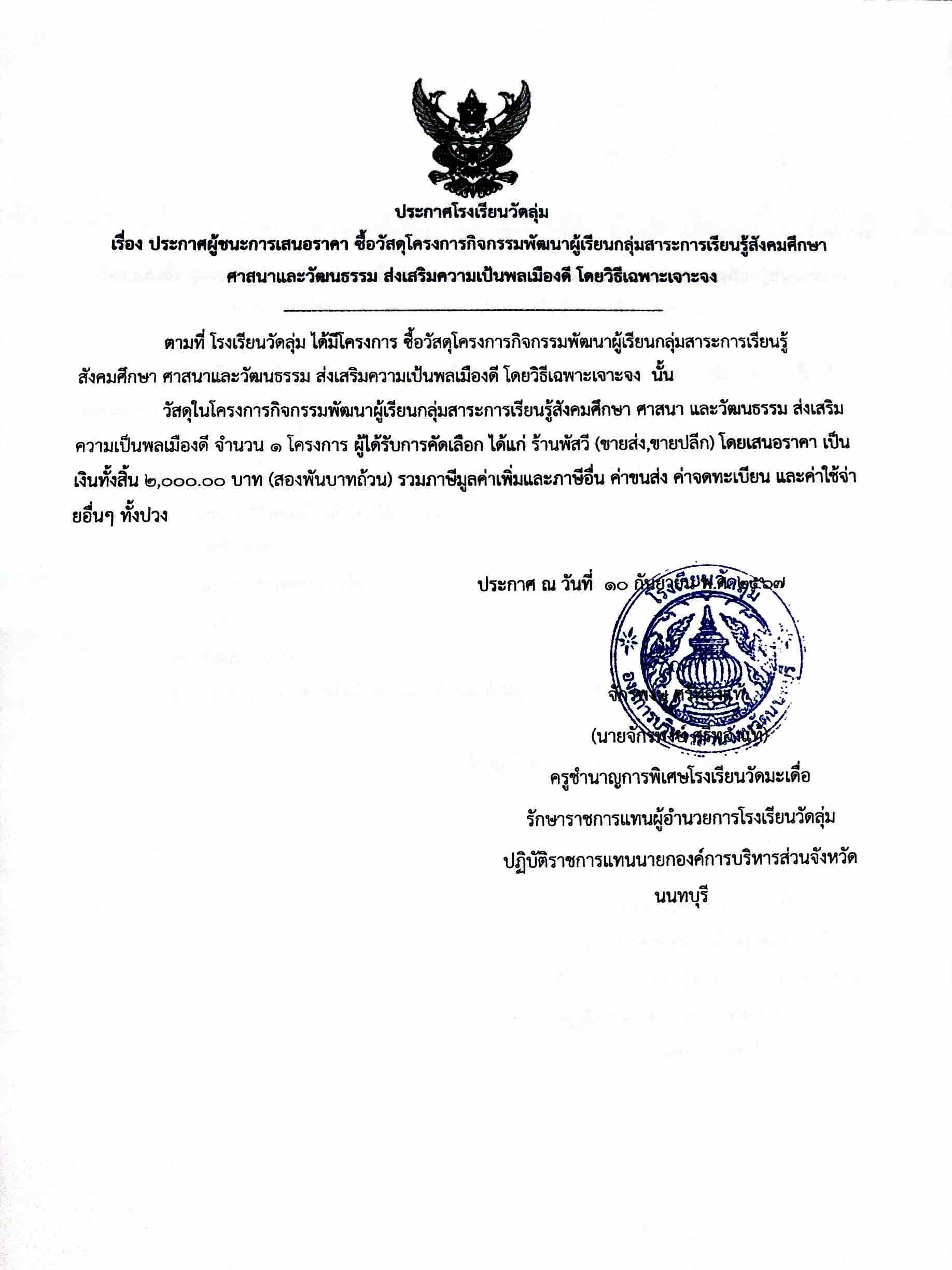 ประกาศโครงการกิจกรรมพัฒนาผู้เรียนกลุ่มสาระการเรียนรู้สังคมศึกษา ศาสนา และวัฒนธรรม ส่งเสริมความเป็นพลเมืองดี