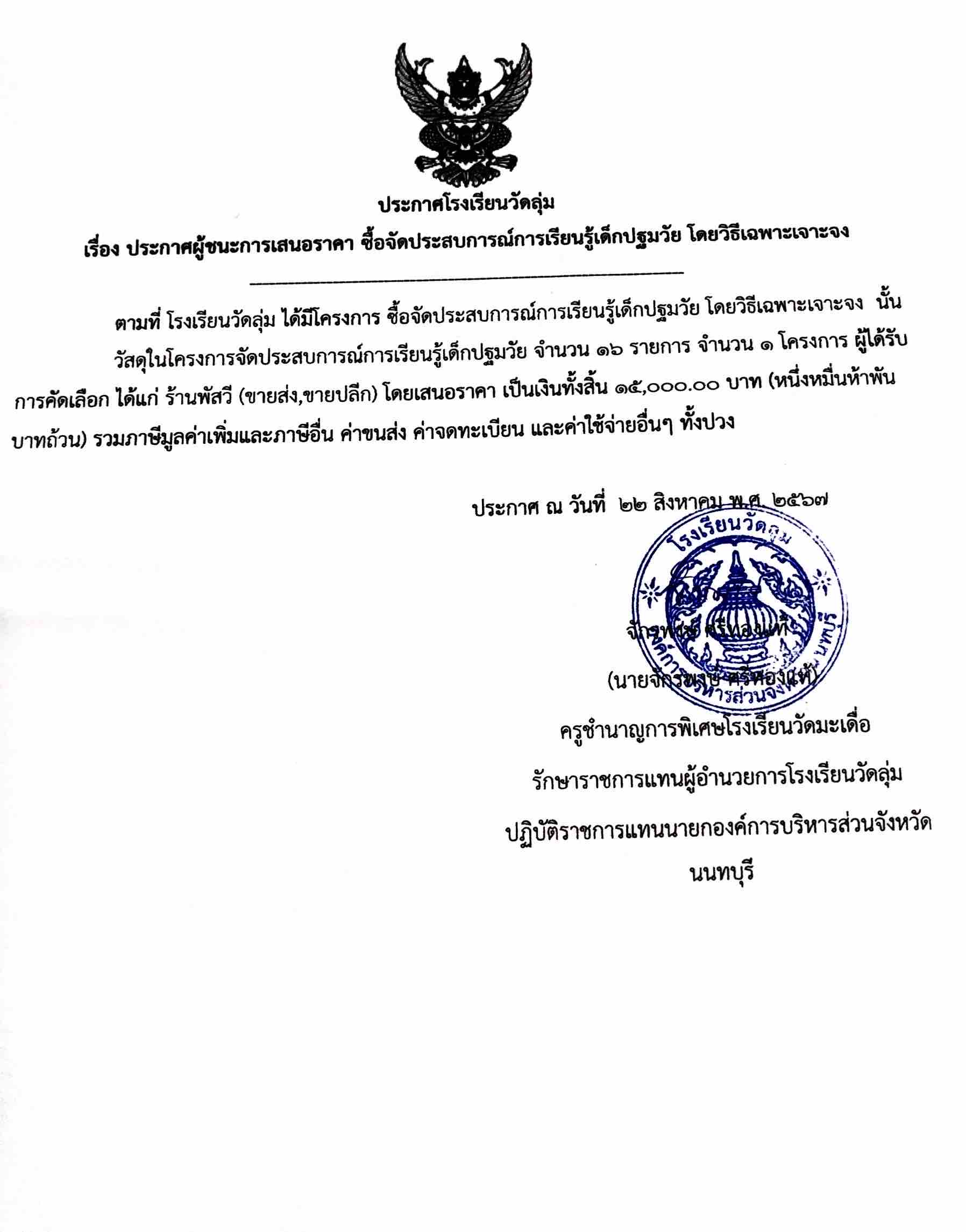 ประกาศโครงการจัดประสบการณ์การเรียนรู้เด็กปฐมวัย